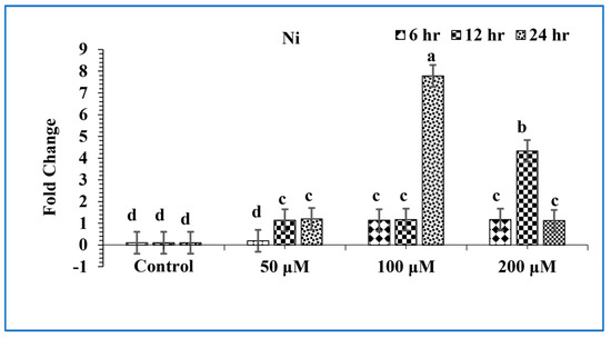 For Cu treatment, plants were sprayed with different concentrations (50 µM, 100 µM, and 200 µM) of copper and then analyzed after 6, 12, and 24 h. Similarly, (Ni) was applied to the second batch of transgenic A. thaliana by spraying with various concentrations of nickel (50 µM, 100 µM, and 200 µM) and then analyzed after 6, 12, and 24 h, respectively, shown in (Figure 4). Experimentation was repeated in triplicates.