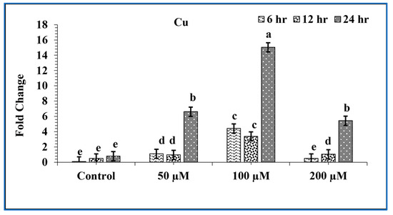 The activity of OsPPOGUS through RT-PCR study with different Cu concentrations. Quantitative RT-PCR was used to detect GUS gene transcript levels in 25-day-old, transformed Arabidopsis T2 lines plants growing on MS media by spraying Cu (50, 100, 200 μM) solutions. The data revealed mean ± standard error (SE). Various letters (a, b, c, d, and e) specify significantly different results from ANOVA post hoc Tukey-adjusted comparisons of three independent tests (p ≤ 0.05, n = 3).