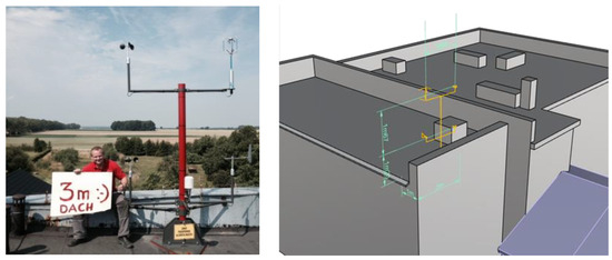 Mast installation on the roof of the building: Cap and vane anemometers (left), dimensions of the mast (right).