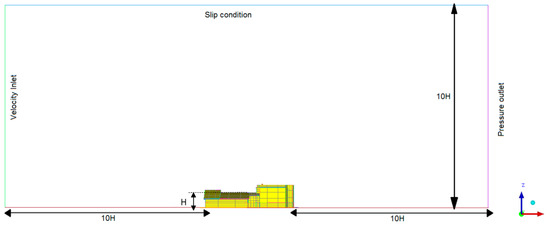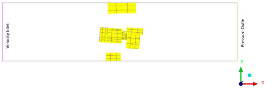 The top boundary condition is set at 10 H and the inlet at 10 H from the building and the outlet at 10 H from the end of the building. In this setting, H is the height of the central building’s front wall, and this is depicted in Figure 4. These are very similar to the dimensions suggested by COST (European Cooperation in the Field of Scientific and Technical Research), and [17,18,19], and are utilized by other researchers [20,21]. These dimensions are selected so that there is no reflection of the disturbance in the domain close to them. To reduce the size of the computational domain, the side boundaries pass through the middle of the neighbouring buildings. This domain will have a substantially smaller mesh size, which has no significant impact on the results.