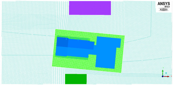 The computational domain includes the main building of interest with all its details and the two nearest buildings that are illustrated in Figure 1. Considering the wind direction, the vegetation cover was removed, as no trees were in the upstream wind. The ground was assumed flat. As discussed in the previous section, the prevailing wind direction was normal to the building’s main axis. The computational domain is depicted in Figure 4 and Figure 5.