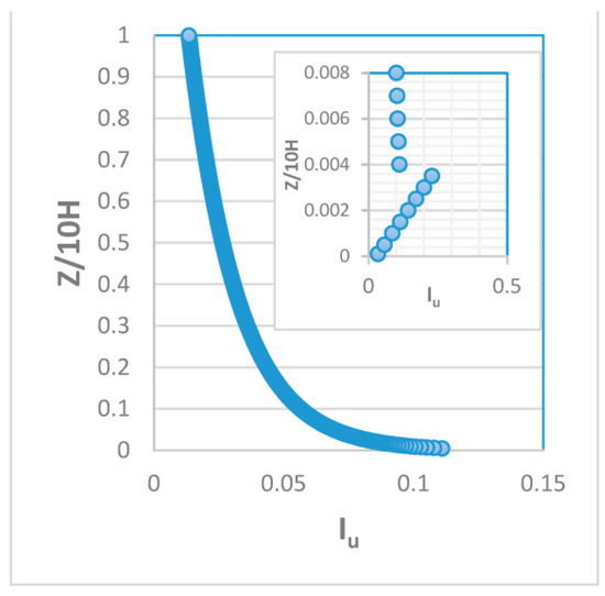 The values of the turbulence intensity and integral length scale for the above calculations were normally obtained from experimental measurements, i.e., Section 2, at the location of the inlet. The integral length scale is the largest Eddy motions in a turbulent flow. The atmospheric integral length scales from measurements are quite large (38~60 m). Implementing these length scales is only possible in mesoscale simulations [2]. Therefore, following the method of Jensen et al. [37] and Berg et al. [2] for scaling the length scale of small hill terrain, we estimated a smaller length scale of 7 at the inlet. As a direct consequence of implementing a scaled length scale at the inlet, the generated length scale at the building roof is not expected to be the same as the measurements. We will investigate the effect of considering these reduced length scales in the generated turbulence in the results section. The turbulence intensity profile, which was implemented at the inlet, is shown in Figure 7. The turbulence intensity increased at a close distance to the wall, and then it decreased with height. All calculations and estimations in this section were based on a neutral atmospheric condition.