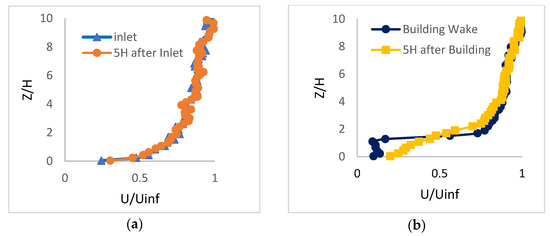 Mean wind profile comparisons (a) between inlet and building, (b) in the building wake.