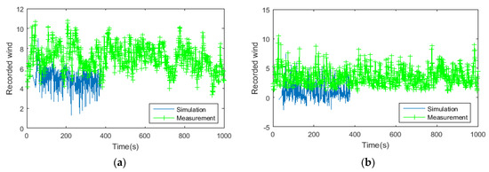 Figure 10 shows the wind history at two points on the top of the building. The points are illustrated in Section 2 and also shown in Figure 3. The data from the measurements are recorded at a frequency of 1.0 Hz for 2 h, and the frequency of sampling for LES is 0.1 kHz for 400 s.