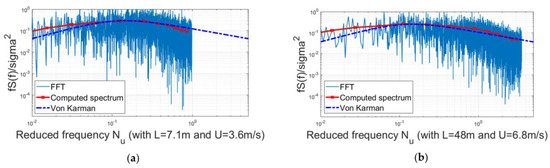where is the energy spectrum of the turbulence flow field, which is calculated from Section 5.2.1. Table 1 illustrates the integral length scales calculated using Equation (9) for the two points of Figure 3. This table shows the ratio of the length scales to the inlet integral length scale, which is 7 ( for LES and 60 ( for measurement. The first and second columns represent the reduced length scale values for the LES and measurements, respectively. As expected, the length scale at both points was decreased at the rooftop due to the presence of the building. Comparing Points 1 and 2, the length scale decreased remarkably at Point 2 for both measurement and LES results. Although there is less than a meter difference between the heights of the two points, both the measurement and simulation show a significant reduction in the values. The significant point about these results is that the LES and measurement values are very similar. This confirms that although the considered inlet length scale is more than 8 times smaller than real wind data, the resolved length scales and their spatial variations at these points are very similar to the measurement values, and they can be scaled up at any location of interest inside the domain for the real length scale predictions. Accordingly, by repeating this simulation for similar problems, then it is possible to obtain an estimation of the real wind turbulence length scales, where no measurement data are available.