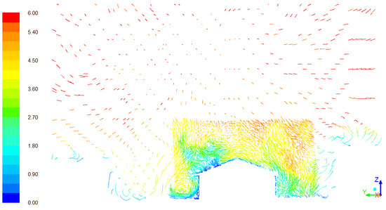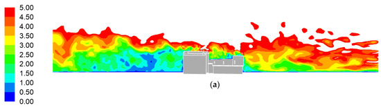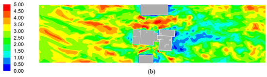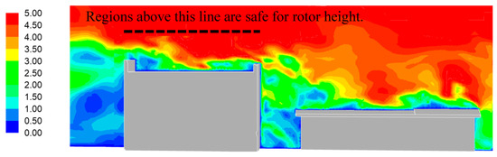 A streamwise view of the velocity contour at the left side of the central building is illustrated in Figure 16. The cut plan at the front part passes the location of the measurement instrument. The roof flow is clearly less disturbed at this location compared with the gable roof. The wind speed at this location is high as well, so this location is potentially suitable for a roof-mounted small wind turbine installation. Another advantage is that the roof is flat at this location, and, therefore, the installation is also much easier compared to the gable roof.
