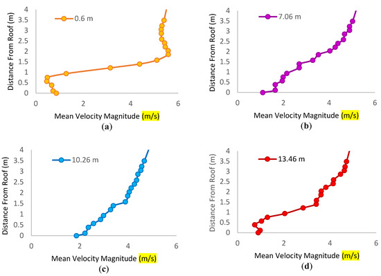 Mean velocity profiles: (a) 0.6 m from the parapet, (b) 7.06 m from the parapet, (c) 10.26 m from the parapet, and (d) 13.46 m from the parapet.