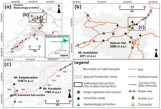Study area: (a) major part of Daisetsuzan National Park; (b) northern part of the park; and (c) location of the studied trail section.