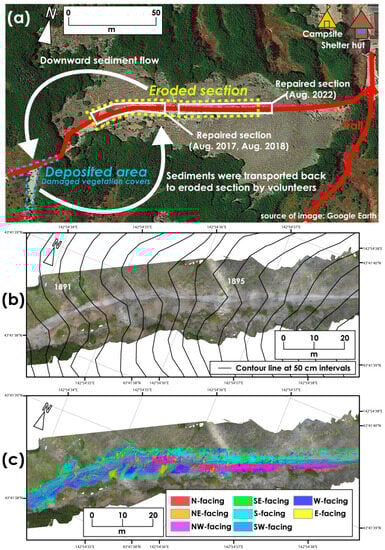 Detailed topography of the study area: (a) distribution of erosion and deposition on the studied trail section and location of repair works; (b) orthophotograph with contour lines prepared using pole photography on 5 August 2022; and (c) slope distribution on and around the trail surface. To show the surrounding topography and location of the trail, contour lines in (b) were created with a 10 m resolution DEM provided by the Geospatial Information Authority of Japan. Therefore, detailed erosion of the trail is not represented.