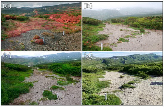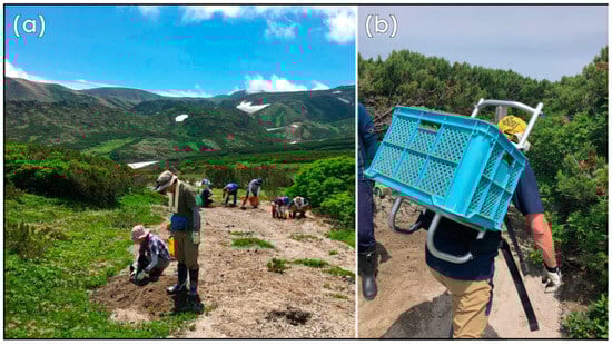 The total length of the mountain trails in the park area is approximately 300 km. The trails are classified into five levels based on the grading system (Daisetsuzan Grade): Grade 1 (short trails to enjoy the beautiful nature) to Grade 5 (trails with extremely challenging terrain). These five grades are determined by the degree of pristine nature, vulnerability of the natural environment, weather conditions, trail distance, presence of shelters and camping grounds, and access to the trailhead [60]. The trail passing through the study area was designated as Grade 3 (accessible by day hikes/trekkers with intermediate experience). The studied trail section (Figure 1b) is located in an alpine zone under the special protection zone designated by the Ministry of the Environment.