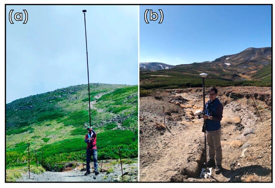 Seven to fifteen ground control points were obtained on the trail by Post-Processing-Kinematic GNSS using Nikon-Trimble Geo 7X and Zephyr Model 2 antenna (Figure 4b) for the precise georeferencing of digital elevation models (DEMs) and orthoimages (i.e., UTM zone 54 N with the data from WGS84). Because there were no obstacles, such as tall trees, near the GNSS antenna, the number of satellites acquired at any given time ranged from 28 to 32. A single ground control point measurement took 3–5 min. The post-processing was performed with Trimble Pathfinder Office software [61], using the observed data and electronic data points provided by the Geospatial Information Authority of Japan [62]. A horizontal accuracy of 1 cm and vertical accuracy of 2 cm were obtained.