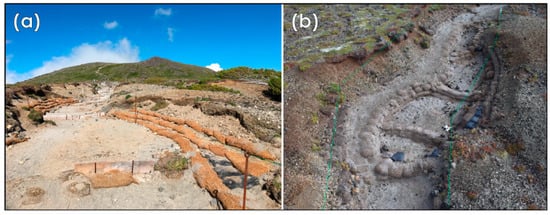 Trail surface (a) before the 1st repair work in 2017; and (b) after the 1st repair work in 2017 (prepared using the UAV and pole-photography mappings).