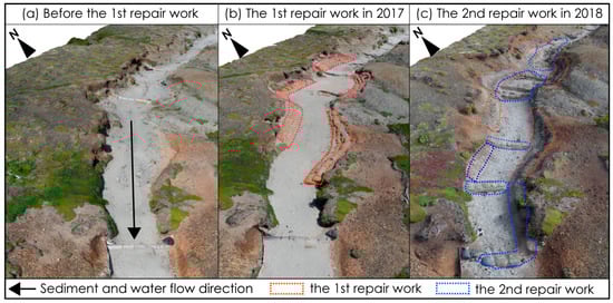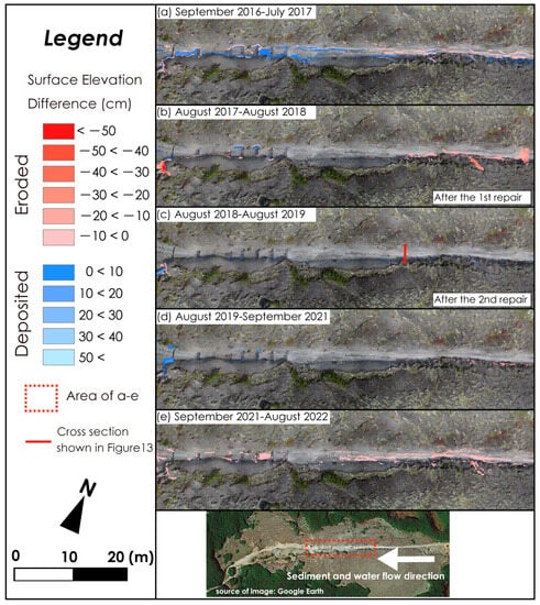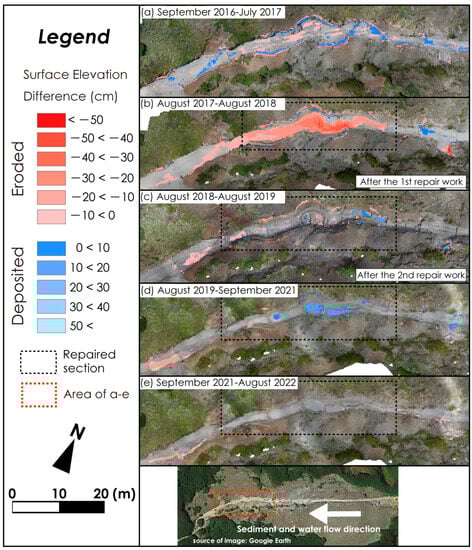 From 2018 to 2019, erosion was still visible on the south-facing lateral slopes. The destination of the eroded sediment was unclear, because the second repair work was conducted during this period. However, Figure 9c suggests that the deposition occurred at the base of the lateral slope. Figure 7c shows the anthropogenic influence of the second repair work.