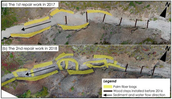 Soil-retaining structures for two purposes: (a) soil-filled palm-fiber bags on lateral slopes in 2017; and (b) soil-filled palm-fiber bags on tread surfaces in 2018. Note that the palm-fiber bags along with the wood steps were used on the tread surface in (a), but the wood steps were removed, as shown in (b).