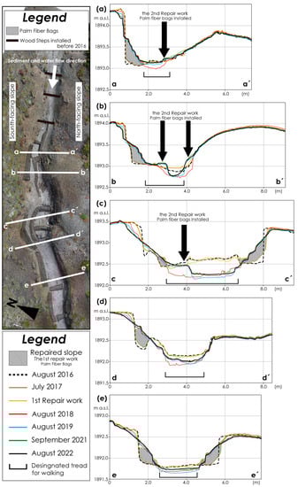 Vertical erosion occurred at many sites between August 2017 and August 2018 (Figure 9b and Figure 10b). Further collapses continued on the south-facing slopes of the trail; however, the collapsed soil mass was trapped by the soil-filled palm-fiber bags (Figure 9b and Figure 11c–e). However, less collapse occurred on the north-facing lateral slope of the trail. Vertical erosion was observed across the entire trail tread. The red line in the profile in Figure 11c suggests 45 cm of vertical erosion, resulting in a large amount of sediment discharge, i.e., −14.71 ± 2.52 m3. In addition, surface water damaged the soil-filled palm-fiber bags at the base of the lateral slopes. However, no lateral slope collapse was observed; therefore, no widening of the trail occurred.