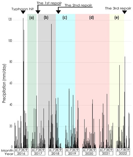 Precipitation (mm/day) at the Sounkyo Meteorological Station in the summer during the study period. Letters (a–e) correspond to those in Figure 9 and Figure 10, and Table 2. Precipitation data from the Meteorological Agency [59]. See Figure 1a for the location of the Sounkyo Meteorological Station.
