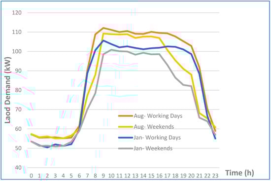 where , , and are constant coefficients that were discovered by monthly regression. The daily average temperature in the specified area for this study is shown by , in degrees Celsius. Noren and Pyrko [60,61] presumptively included grocery retailers’ gross floor area (GFA) and sales floor area (SFA). Through the analysis of the data, it became clear that SFA consumes significantly more electricity than GFA. The existence of numerous refrigerators in SFA is the primary cause of this discrepancy. Therefore, all the aforementioned equations were programmed in MATLAB software, taking into account a supermarket measuring 1000 m2 situated in Malmö. Figure 2 illustrates the average real hourly load profile in January and August 2010 for the area of 1000 m2 on weekends and working days. The estimation was based on the outdoor-temperature data [59].