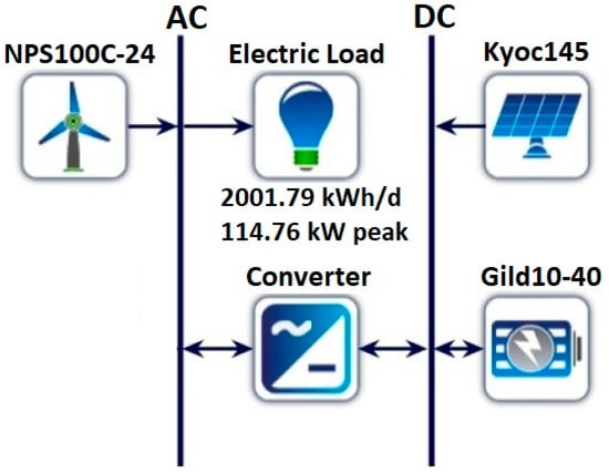 The hybrid system’s structure is shown in Figure 3. In this figure, it is shown that the wind turbines and electric loads are linked to the AC busbars, whereas the PV panels and batteries are linked to the DC busbars. Moreover, a pair of bi-directional converters was used to connect two busbars.