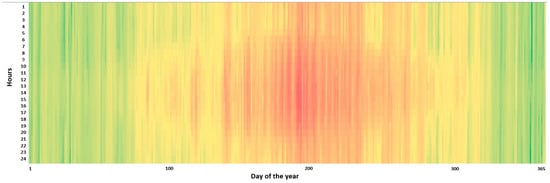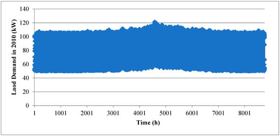 In addition to the developed metaheuristic approach, a simulation method is considered to optimize the proposed hybrid system using HOMER Pro software. According to the hourly outdoor temperature that HOMER uses, the load demand for a supermarket measuring 1000 m2, located in Malmö, in 2010, is shown in Figure 4.