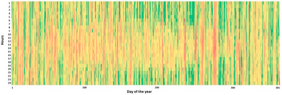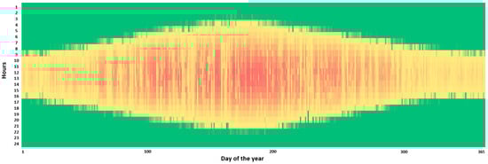 The Swedish Meteorological and Hydrological Institute (SMHI)’s data bank was used to gather the real sun-irradiance, wind-speed, and ambient-temperature data [59]. Figure 5 displays the heat map of horizontal solar radiation in Malmö. The greatest and the minimum daily irradiances 23re reported in July and December, and the average annual global irradiance was 2.73 .