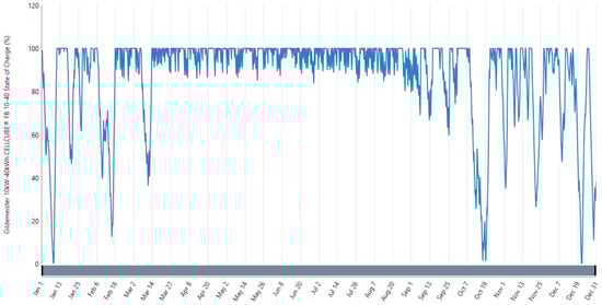 The proposed model of the battery bank’s charging and discharging scenarios was generated from Maleki et al.’s model [49] by using Equations (3) and (4), respectively. The investigation used a Gildemeister 10 kW–40 kWh CELLCUBE® battery, USA.