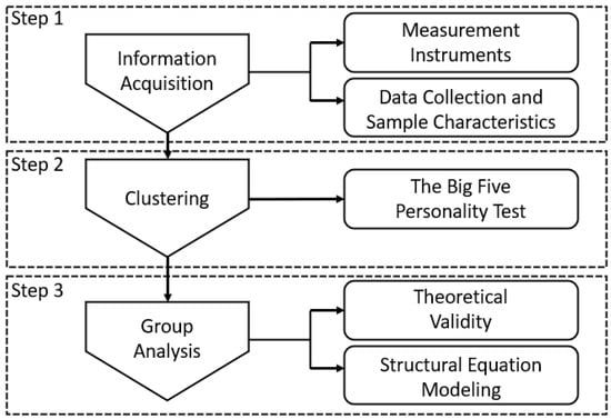 The research employs a three-step approach for data analysis. Figure 2 illustrates the detailed stages of the data analysis. The first step focuses on acquisition of the data, measurement instruments, and sample characteristics. The second step is to cluster the respondents according to their personality traits using the Big Five personality test. The third step focuses on group analysis to compare the psychological and behavioral characteristics as well as predictability and expected variance to better understand the psychological patterns that affect the three studied pro-environmental behaviors. More detail is shown in the following subsections.
