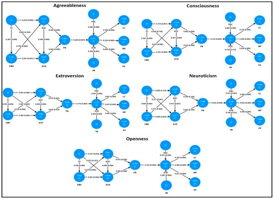In this work, we analyze the proposed model six times: once for the total population and another five for each personality trait. PLS-SEM was used to test the models, and SMART PLS 4.2 was employed in this process. PLS-SEM, or partial least squares structural equation modeling, can handle complex models and determine parameters under non-normality. As a result, this strategy is well-liked and well-established among researchers in numerous domains [76,77]. The measurement model assessment was performed in the first stage of the data analysis for the current study, and the structural model assessment was performed in the second step [78].