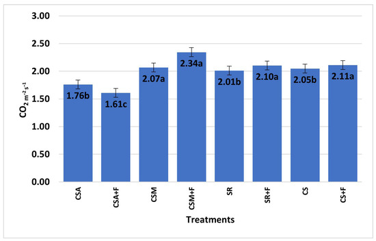 The soil net CO2 exchange rate (NCER) was measured five times during vegetation (Figure 1). NCER was highest in the treatment CSM+F (Bacillus megaterium, Acinetobacter calcoaceticus, and Trichoderma reesei + NPK). It was 32.95% higher than in CSA (chopped straw without fertilizers) and 45.34% higher than in CSA+F (chopped straw + ammonium nitrate + NPK). The average values of the two treatments (CSA and CSA+F) were 23.58% lower than the average values of the highest ones (CSM and CSM+F). The treatments CSM, SR+F, and CS+F did not differ significantly from each other.