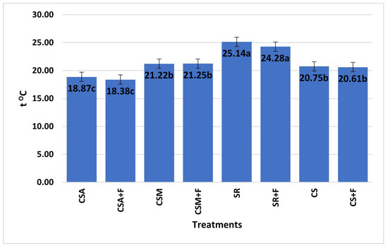 Soil temperature was determined at the same time as NCER. It was also measured five times during vegetation. Soil temperature in experimental treatments averaged from 18.38 to 25.14 °C (Figure 2). The mean value of soil temperature in treatments CSA and CSA+F was 18.63 °C, and it was 16.14% lower than in other treatments.
