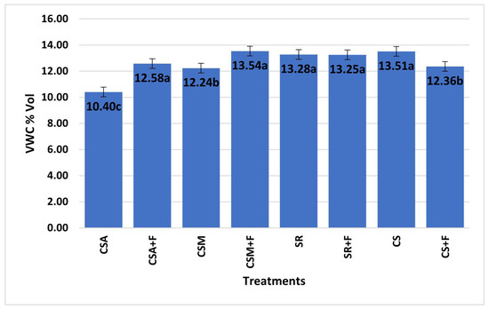 Soil moisture is an important factor in the mineralization and humification of organic carbon, a transformation of nutrients into forms accessible to plants. In the 2021 growing season, the mean volumetric soil water content (VWC) varied from 10.4% to 13.5% (Figure 3). The lowest VWC was registered in treatment CSA—10.4% (chopped straw + ammonium nitrate)—and the highest in treatment CSM+F (Bacillus megaterium, Acinetobacter calcoaceticus, and Trichoderma reesei + NPK)—13.54%. In addition, soil VWC was very similar in all the treatments with the use of bioproducts, and these results were equivalent to the VWC with the use of ammonium nitrate. From the data obtained, we can summarize that the treatments investigated did not influence VWC.
