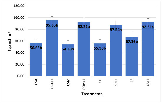 NPK fertilizers have a decisive effect on ECp. Moreover, the effectiveness of biological products sprayed to promote straw mineralization (CSM and CSM+F) was comparable to that of ammonium nitrate (CSA and CSA+F) for the ECp index. Wei and others find that the incorporation of wheat straw, in comparison with chemical fertilizers alone, had a very significant effect on the available nutrients in the 0–40 cm soil layer, especially in the top layer of soil (0–20 cm) [2]. We also found a trend: in treatments with straw returned (CSA, CSA+F, CSM, CSM+F, CS, and CS+F), ECp was 6–7% higher than in treatments with straw removed (SR and SR+F).