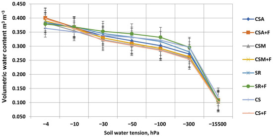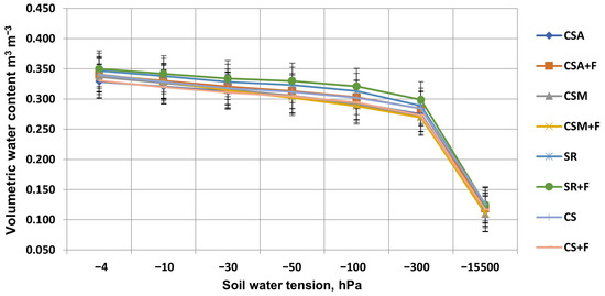 Straw handling methods also caused dissimilar soil WRC within the 10–20 cm layer, but they were not as pronounced as at the 0–10 cm depth. Soil water content within the 0–10 cm layer revealed that the effect of residue handling on WRC at −4 hPa, −10 hPa, and −30 hPa was similar. It is important to notice that WRC at −50 hPa, −100 hPa, and −300 hPa was significantly higher in SR and SR+F treatments. Water retention at −15,500 hPa suction was similar in all the treatments. In addition, the plant available water content (PAW) within the 10–20 cm layer of SR and SR+F treatments was 7% greater than in all treatments with residue returning (Figure 7). The response of pore-size distribution (PSD) was a valuable tool to explain the effect of straw handling on soil pore geometry changes. It was revealed that the soil mesopore volume reliably decreased compared to the treatments where straw was removed (Figure 8). The volume of mesopores in SR and SR+F treatments (straw removed from the field) was 6% higher than in treatments where straw was returned. The distribution of macro- and microporosity was insignificant. We can assume that straw acted as a pore-clogging material within the overall arable layer, significantly decreasing mesoporosity [9].