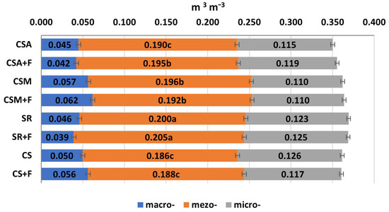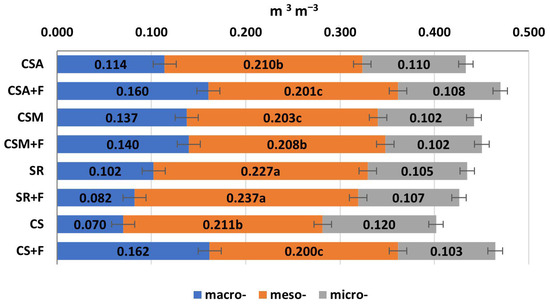 Despite the fact that straw increased the total porosity, the mesopore volume was reliably reduced compared to the treatment with straw removal (Figure 6). The volume of mesopores in SR and SR+F treatments (straw removed from the field) was 13% higher than in treatments where straw was returned. The distribution of macro- and microporosity was insignificant.