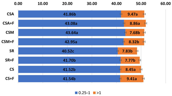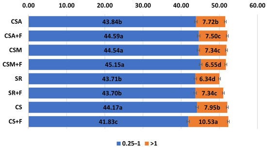 The mean stability of soil aggregates with a diameter of 0.25–1 mm within a depth of 10–20 cm was 42.10%. In treatments CSA+F, CSM, and CSM+F, the stability of soil aggregates was significantly higher than in other treatments. The mean stability of aggregates larger than 1 mm within a 10–20 cm depth reached 8.47%. In treatment CSA, CSA+F, and CS+F, this index was significantly higher than in other treatments. The total stability of all aggregates (10–20 cm) reached 50.47% (Figure 10).