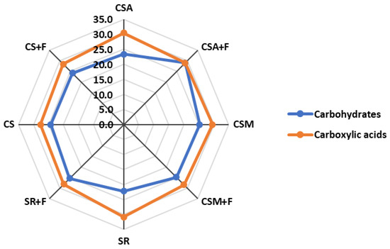 Changes in carboxylic acids depend mainly on seasonality, vegetation type, soil type, and depth. Carboxylic acids were the most dominant group of carbon sources and accounted for 29.1% of all carbon sources (Figure 11) in the experiment. Only in the treatments CSA, CSM, and SR-F has a higher content of carboxylic acids been identified than the experimental average. The largest carboxylic acid content was determined in the treatments SR and CSA. It was 30.8% and 30.4%, respectively. A somewhat lower content was determined in the treatment CSM—29.6%. The lowest carboxylic acid content was determined in treatment CS—27.7%.