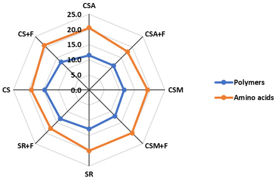 Amino acids are an important source of nitrogen for plants. Millions of proteins are known to be involved in vital processes. Amino acids reduce plant stress and improve photosynthesis. Amino acids averaged 19.4% of all carbon sources (Figure 12) in the experiment. In the treatments CSA, CSM+F, SR, and CS+F, there was a significantly higher content of amino acids compared to the average value. The largest content of amino acids was determined in the treatments CS+F and CSA. It was 20.9% and 20.5%, respectively. The lowest content of amino acids was determined in the treatments CSA+F and SR+F. It was 17.9%, respectively.