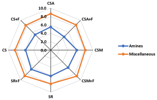 Amine augmentation in the soil is very important to mitigate CO2 emissions. Amines are a major part of the factors controlling vital processes and a key element in amino acids and protein membranes. Amines and miscellaneous were the smallest groups of carbon sources and averaged 5.7% and 8.4% of all carbon sources, respectively (Figure 13) throughout the experiment. In the treatments CSM, CSM+F, SR, SR+F, and CS, the content of amines was significantly higher compared to the experiment average. The largest content of amines was determined in the treatment SR+F, and it was 6.5%. In the treatments of CSM and SR, it was 6.2%. The lowest content of amines was determined in the treatment CSA+F (4.5%).