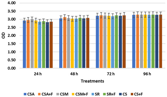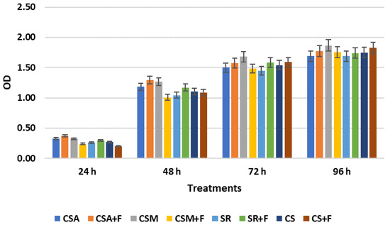 The highest OD values were detected after 96 h of incubation in treatments CSM and CS+F (1.87 and 1.83, respectively). In the treatments CSA and SR-F, the OD values were the lowest (1.69) and differed from the maximum values by 8.23–10.50%.