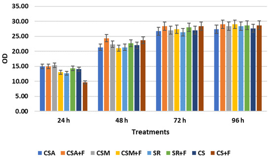 The average OD value after 72 h was 27.38. In CSA+F, SR+F, and CS+F treatments, the OD values were higher than the average. The average OD value after 96 h increased and reached 28.38. In the CSA+F, CSM+F, SR+F, and CS+F treatments, the OD values were higher than the average. The highest OD values were detected after 96 h of incubation in the treatments CSA+F and CSM+F (29.0). The lowest OD values were detected in the CSA and CS treatments—they were 27.33 and 27.67, respectively.