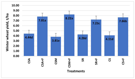 Data revealed the expected effect of a seven-year-long application of microbiological measures on plant productivity. Winter wheat grain yield in the experiment varied from 3.81 to 8.22 t/ha (Figure 17). Grain yield was mainly dependent on the application of mineral fertilizers. Fertilization increased yield by 69–116% compared to unfertilized crops. Traditional technology (CSA+F; chopped straw incorporation + ammonium nitrate for decomposition + NPK fertilization) caused a grain yield of 7.81 t/ha, which was 76% higher than without fertilization (CSA). The effectiveness of microbiological products (CSM+F) was significantly higher, as they caused a 116% higher grain yield compared to unfertilized crops (CSM). The effectiveness of fertilization in the treatment with straw removal (SR+F) was not so high; NPK fertilizers increased grain yield by 69% compared to unfertilized crops.
