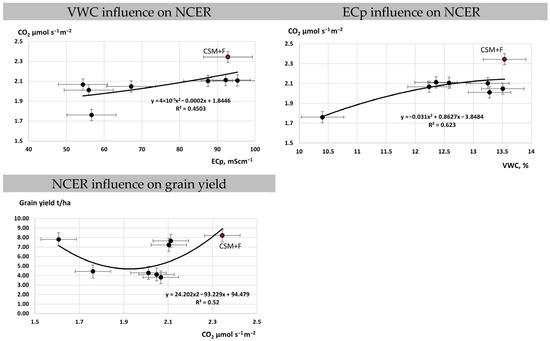 The net CO2 exchange rate (NCER) can be described as a soil vitality index. We can conclude that the higher soil net CO2 exchange rate depended more on the biological means used than on straw management. Treatments with ammonium nitrate revealed the lowest results compared to other treatments. A possible reason may be that the use of ammonium nitrate causes soil acidification [8]. Many microorganisms struggle to function properly under conditions of increased acidity. We assume that the reduced content of microorganisms caused a decrease in NCER. We found that NCER significantly depended on soil water content and crop nutrition conditions. The higher the water content found, the higher the NCER registered. The higher the ECp was determined, the higher the NCER was registered. This research confirmed that bioproducts applied favored soil vitality in general by exhibiting higher soil microbiological activity. As a result, a healthy and more viable Cambisol produced a higher grain yield in agricultural crops (Figure 18).