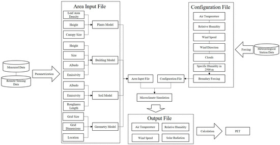 ENVI-met is a three-dimensional microclimate model with high spatial and temporal resolution that is currently the most widely used urban microclimate simulation research tool in the world [18,30]. The ENVI-met model is primarily composed of two main components in the pre-processing (Figure 3), which are used to generate “Area input file” and “Configuration file” [31]. In the “Area input file”, the first step involves creating a detailed geometry model of the site. This includes specifying the model’s location, defining its geometry, and setting up nesting grids for more refined simulations if needed. Next, a comprehensive database of building materials, soils, and plants is established based on their physical and thermal properties. This database is crucial for distinguishing between different underlying surface models and vegetation models. The leaf area density (LAD) is particularly important for accurately representing the vegetation model. In addition, a numerical simulation of the meteorological model must be constructed, including , RH, U, WDir, specific humidity at a height of 2500 m, and cloud cover for boundary simple forcing. After the simulation, we obtain “Output file” which contains the simulated temperature, humidity, wind speed, and solar radiation—four basic parameters for the calculation of the thermal comfort index PET.
