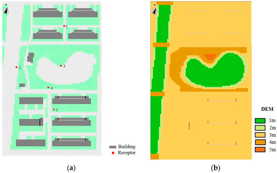 (a) The locations of buildings and receptors; (b) the DEM model for the ENVI-met simulation.