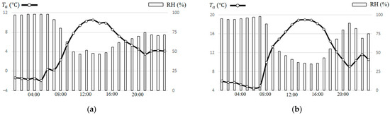Hourly and RH data from the Fengxian meteorological station on (a) 20 January and (b) 6 March 2023.