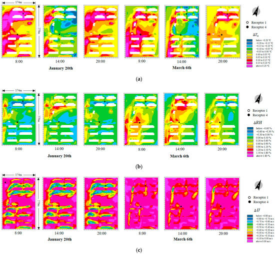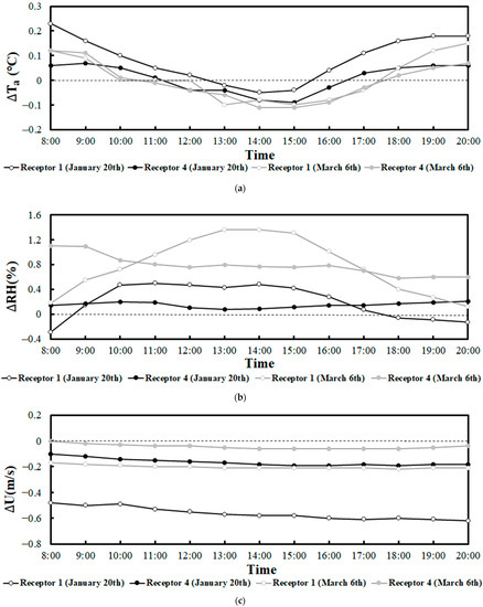 Bernatzky [49] found that green spaces in urban areas can increase the relative air humidity by 5–10%. The humidifying effect of green spaces mainly stems from the influence of the vegetation canopy [50], with plant leaves’ transpiration being the primary reason for this effect [51]. As a result, the highest humidifying effect of the vegetation canopy was observed at midday in the densely covered receptor 1 (Figure 8b). The wind fields have a significant effect on the humidifying effect of green spaces [52]. The background wind speed of 20 January (3.12 ) is significantly higher than that of 6 March (2.26 ). The higher wind speed facilitates rapid water vapor diffusion from beneath the canopy, resulting in a lower daily average humidifying effect on 20 January than on 6 March.