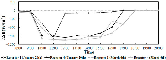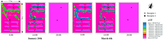 Throughout the day, the amount of SR reduced by the vegetation canopy initially increased and then decreased. Notably, the amount of SR decreased more on 6 March than on 20 January (Figure 10), which indicated that the shading effect of the vegetation canopy was more pronounced in early spring. For example, on 20 January, at receptor 1 increased by 873.86 from 11:00 to 12:00. This increase was attributed to the buildings in the south, which weakened the shading effect of the vegetation canopy on near-surface solar radiation during that hour.