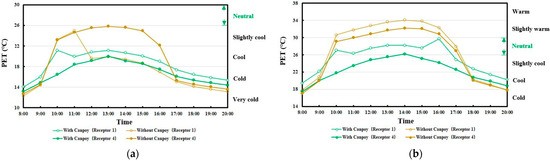 Figure 12 shows the variation of PET at receptors 1 and 4 when affected by the shading effect from 8:00 to 20:00. Comparing the thermal sensation of receptors 1 and 4 in the designed case (without vegetation canopy, which is only affected by the shading effect of the building), the thermal sensation of receptor 4 is closer to “Neutral”, which is the comfort feeling. Thus, we can conclude that the shading effect of buildings makes people uncomfortable in the winter. However, the wind shield effect of the buildings will benefit thermal comfort, leading to a higher PET in the original case (with vegetation canopy) from 12:00 to 16:00 on a typical cold day like January 20. In the original case, receptor 1 is influenced by both buildings and vegetation canopies, whereas receptor 4 is solely affected by the presence of vegetation canopies. The shading effect of the vegetation canopy led to a reduction in solar radiation at pedestrian height, resulting in a decrease in PET and an increase in cold discomfort. It can be found that the PET is lower in the original case (with vegetation canopy) than the designed case (without vegetation canopy) from 10:00 to 16:00 (Figure 12). 20 January was a typical sunny but cold and windy winter day. 6 March was a cold early spring day with sunny weather and a slightly lower wind speed than 20 January, which represented better thermal comfort. Specifically, PET decreased significantly by about 5.5 °C on January 20, leading to an increase in cold discomfort (the thermal sensation changed from “Slight cool” to “Cool”). The shading effect of the vegetation canopy reduced the “Neutral” thermal sensation from seven hours (10:00–16:00) to one hour (10:00) on 20 January. Unlike on 20 January, the vegetation canopy consistently improved thermal comfort throughout the day on 6 March. The number of cold and uncomfortable hours decreased during the morning and evening, and the “Neutral” thermal sensation at receptor 1 increased from one hour (17:00) to eight hours (10:00–16:00) during the daytime.
