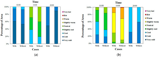 The percentage of area in different thermal sensations at pedestrian height between the original case (with vegetation canopy) and the designed case (without vegetation canopy) on (a) 20 January, and (b) 6 March 2023.