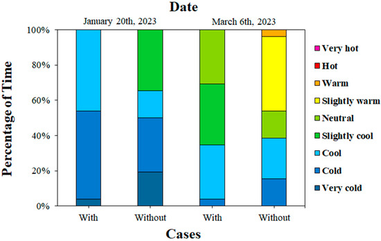 Furthermore, the current study calculated the changes in spatial and temporal percentage of each thermal sensation scale from the case with vegetation canopy to the case without vegetation canopy to quantify the impact of the vegetation canopy on the thermal environment (Figure 13 and Figure 14). As shown in Figure 13a, on 20 January, the percentage of the “Very cold” sensation area decreased from 60.79% to 52.72% at 8:00 in the morning, while at 14:00 in the afternoon, the “Neutral” sensation area increased from 28.33% to 39.06%. At 20:00 in the evening, the “Very cold” sensation area increased from 48.65% to 88.81%. As shown in Figure 13b, on 6 March, the sum of “Cold” and “Cool” sensation areas decreased from 60.07% to 37.56% at 8:00 in the morning. At 14:00 in the afternoon, the sum of “Slightly warm” and “Warm” sensation areas increased from 70.60% to 89.41%. At 20:00 in the evening, the area of “Cold” sensation increased from 31.17% to 58.80%. Figure 14 shows the percentage of time from 8:00 to 20:00 for different thermal sensations at receptors 1 and 4. On 20 January, the sum of “Very cold”, “Cold” and “Cool” sensation time decreased from 100% to 65.38%. On 6 March, the sum of “Cold”, “Cool” and “Slightly cold” sensation time decreased from 69.23% to 38.46%. On the whole, when there is no vegetation canopy, the area and time spent experiencing the cold discomfort will be reduced in the daytime. However, it may increase “Slightly cold” discomfort in the evening (20:00).