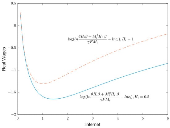 The real wage () determines manufacturing agglomeration by driving labor mobility. Referring to the previous studies, we set , , , and . We first examine the effect of the Internet on real wages by focusing on . This formula shows the U-shaped relationship between the Internet and real wages, as illustrated in Figure 1. Holding that the level of human capital remains constant, the Internet exerts a centripetal force on manufacturing agglomeration primarily through the productivity gains derived from its network effects. This leads to increased profits for firms and higher real wages for skilled labor, thereby promoting manufacturing agglomeration. The centrifugal force of the Internet on manufacturing agglomeration primarily arises from the Internet usage costs and congestion costs. These factors reduce firms’ profits and the real wages of skilled labor, subsequently inhibiting manufacturing agglomeration. If the centripetal force of agglomeration created by the Internet is weaker than the centrifugal force, the Internet leads to manufacturing decentralization. Conversely, if the centripetal force is stronger than the centrifugal force, the Internet drives manufacturing concentration. Therefore, we propose the following: